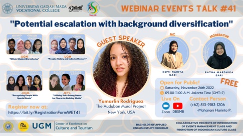 Webinar Events Talk #41 has a different topic from the previous WET. “Potential Escalation with Background Diversity” has become the main topic of this session. It was held with different times, Saturday, November 26th 2022 at 09.00 – 11.00 a.m (Jakarta Time) and Friday, November 25th 2022 at 09.00 – 11.00 p.m (New York Time). That is because this webinar invites the guest speaker from New York, USA, Ms. Yumarlin Rodriguez or usually called Ms. Yumi.
